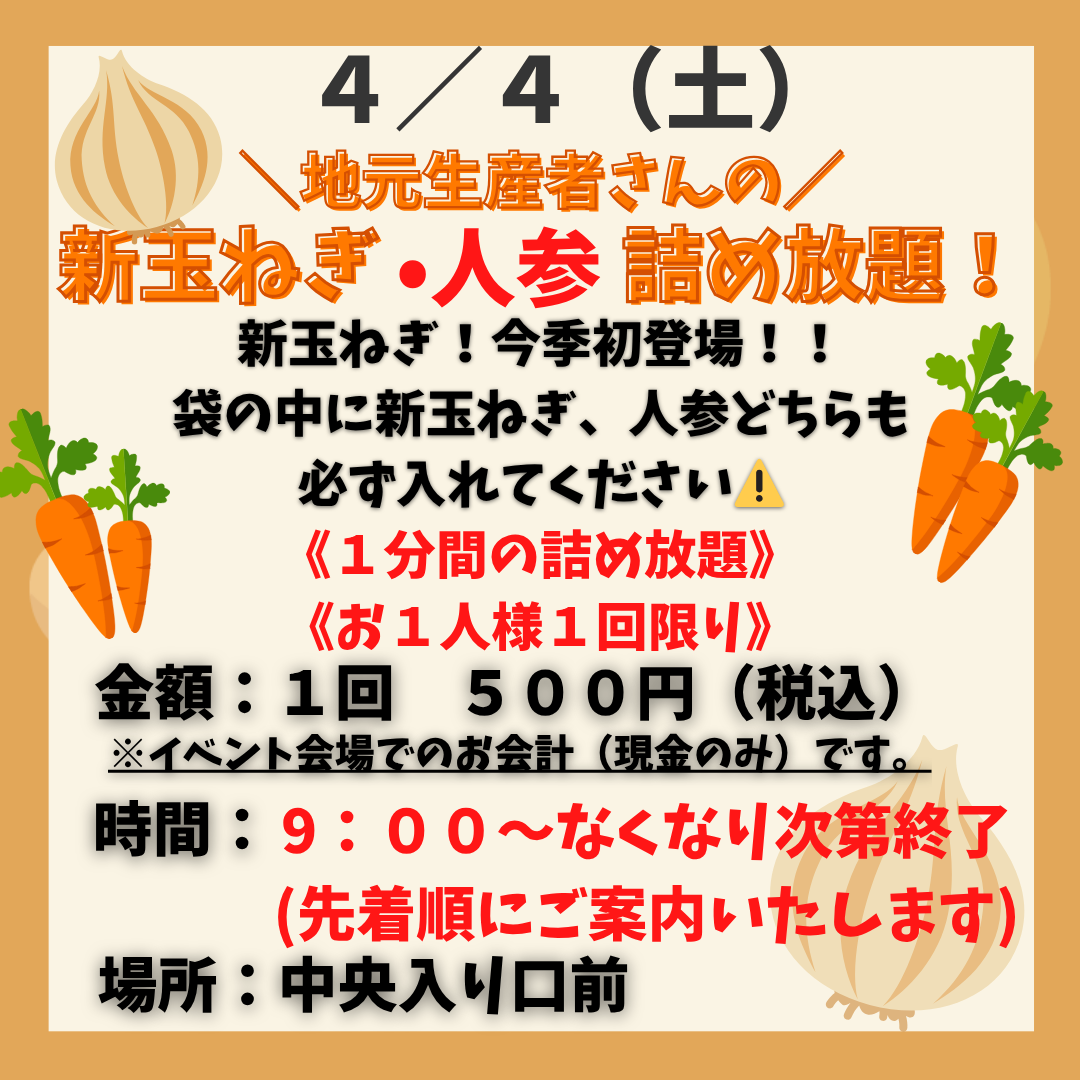 4/4(土)新玉ねぎ・人参詰め放題☆